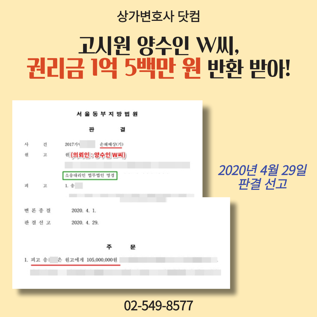 그 결과 W씨는 2020년 4월 29일, 서울동부지방법원으로부터 손실을 인정 받으며 승소 판결을 받습니다.